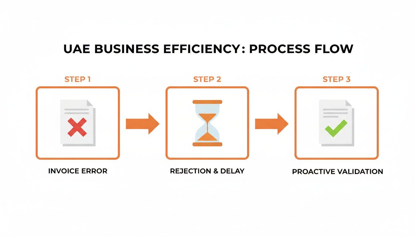 In the UAE's fast-moving economy, efficiency isn't just a buzzword—it's essential for keeping your business ahead. Waiting around for an Accredited Service Provider (ASP) to reject an e-invoice is a reactive game that creates frustrating bottlenecks. It's an old-school cycle that leads to delayed payments, wastes hours on manual fixes, and even puts you at risk for non-compliance penalties.
